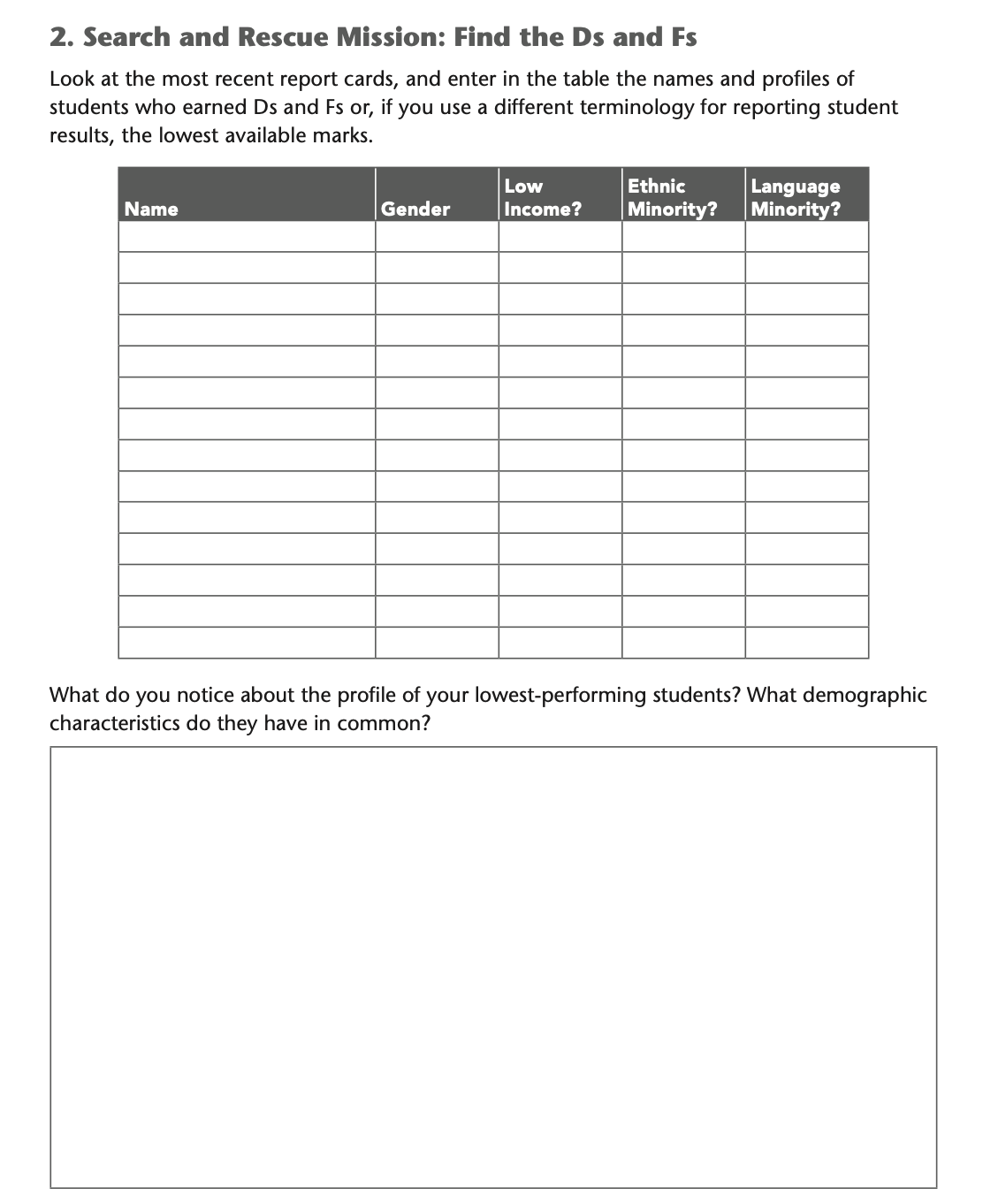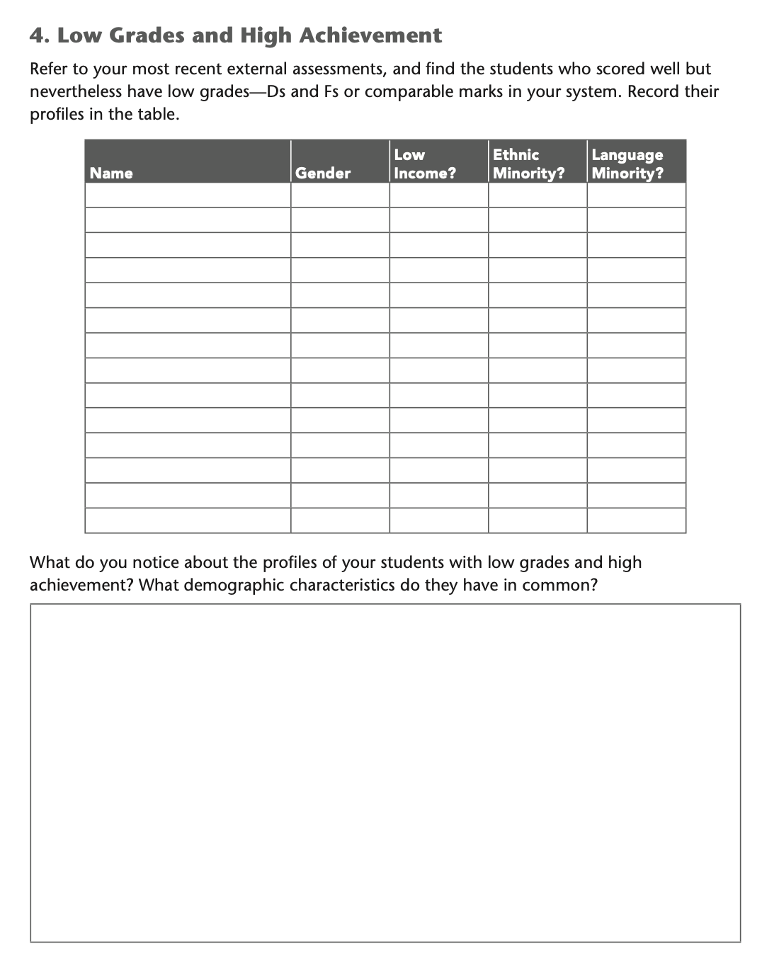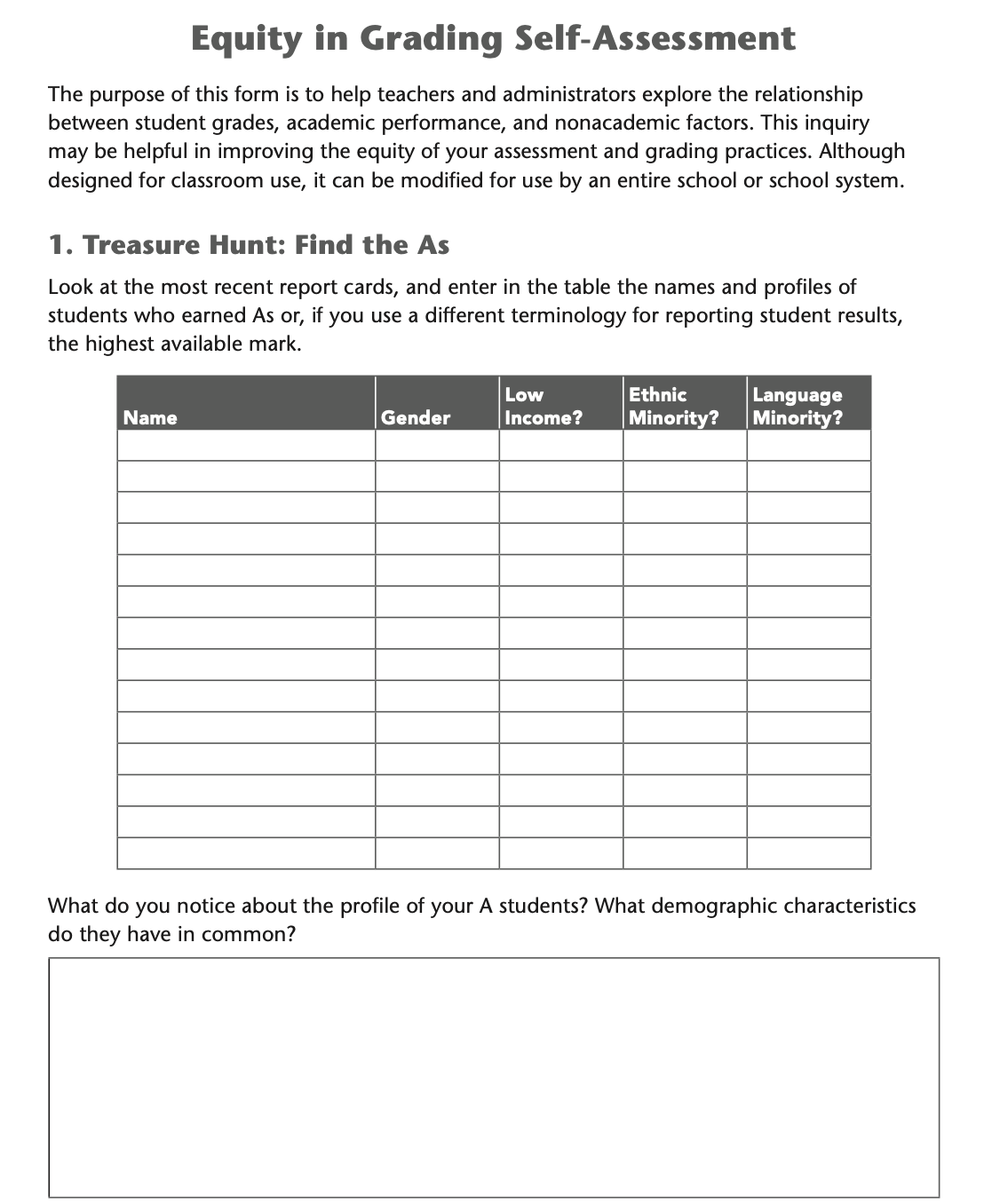 The purpose of this form is to help teachers and administrators explore the relationship between student grades, academic performance, and nonacademic factors.